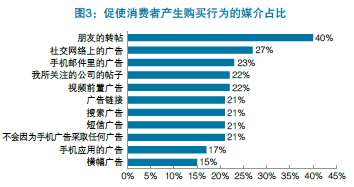 ●手机广告效果奇佳,尤其是从朋友那里获得的广告。33%的受访者表示曾经基于手机广告进行购买,其中,促使消费者产生购买行为的媒介占比中,40%是因为朋友转贴的广告而让起产生购买的欲望。